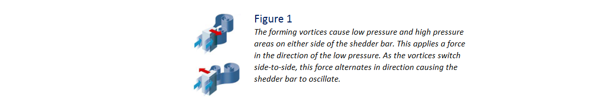 當(dāng)渦流形成并通過發(fā)生體(阻流體)時(shí),與流體的其余部分相比,它們產(chǎn)生了低壓。這種低壓在發(fā)生體上產(chǎn)生壓差(dp)。dp的高壓側(cè)向低壓方向?qū)Πl(fā)生體施加應(yīng)力。由于渦流從一側(cè)向另一側(cè)切換,低壓側(cè)的位置交替變化,所施加力的方向變化導(dǎo)致發(fā)生體振蕩。該振蕩就是卡門渦頻率。